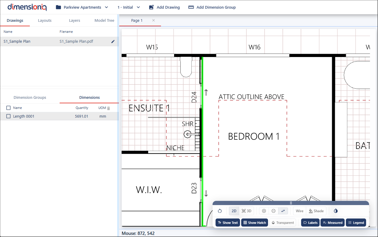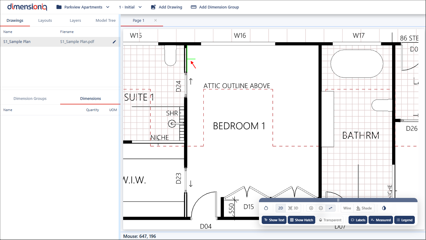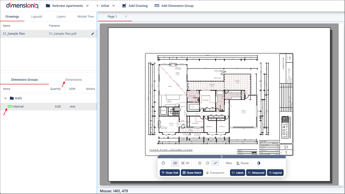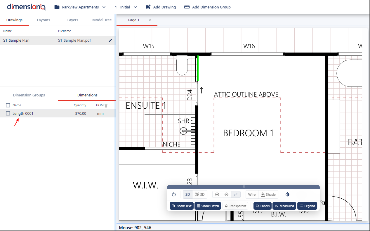 DimensionIQ allows users to take accurate measurements directly from the drawing interface and organize them within selected dimension groups.