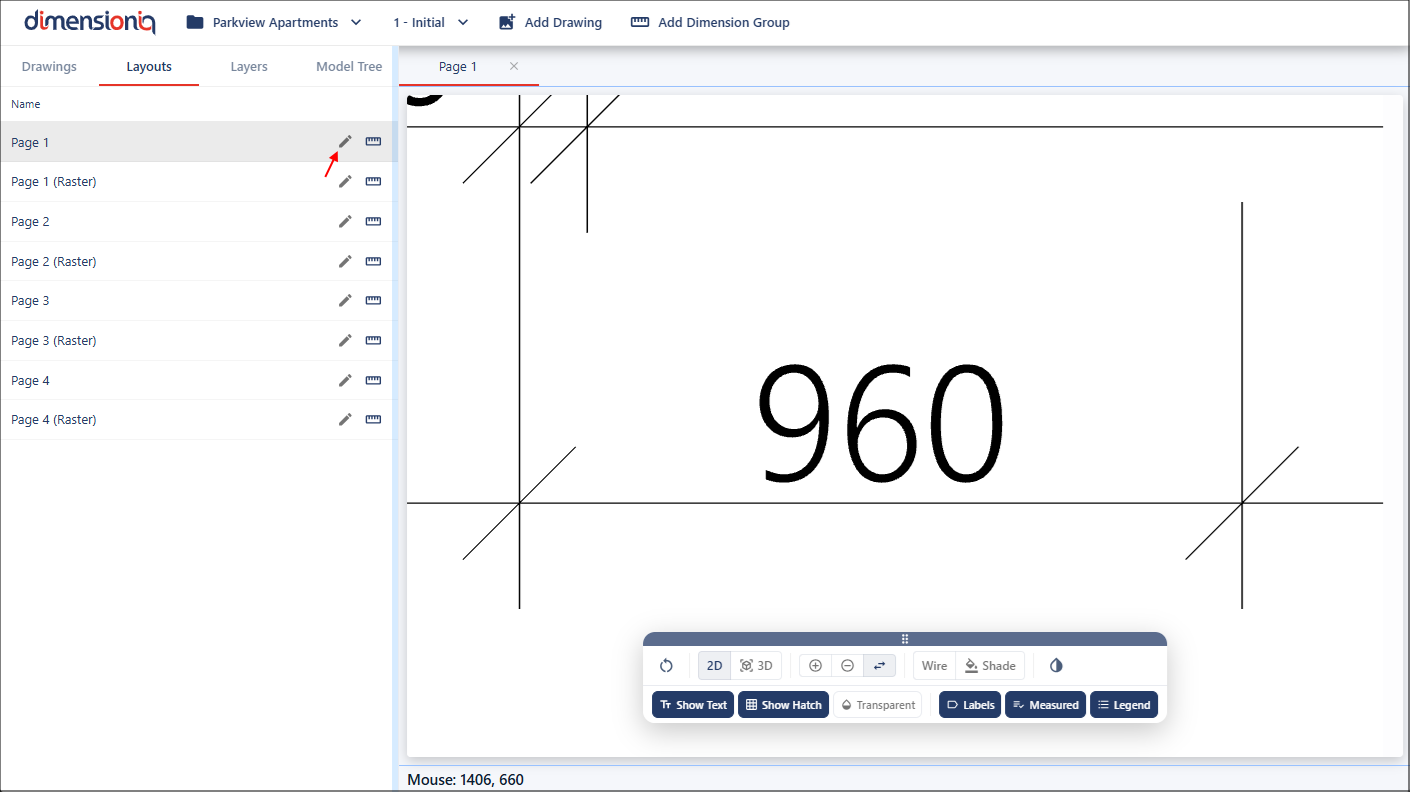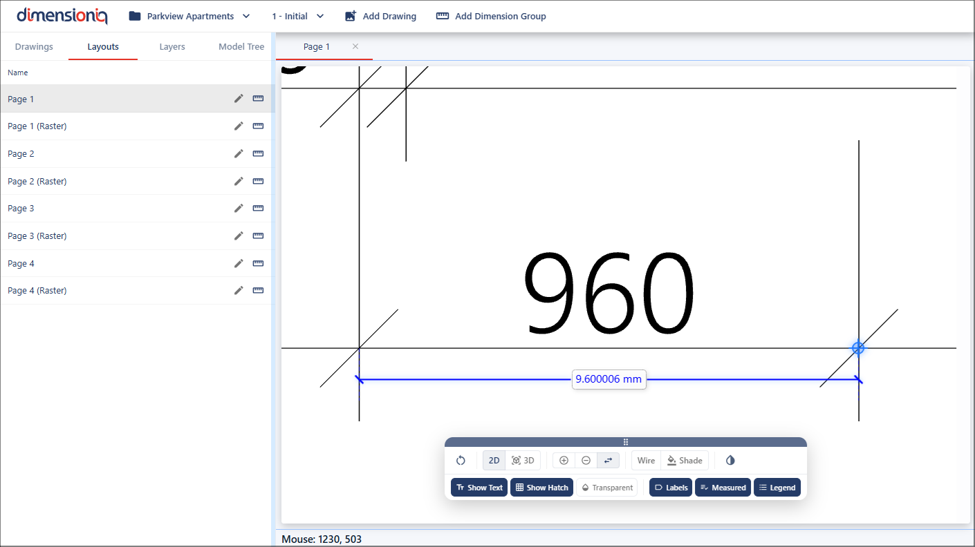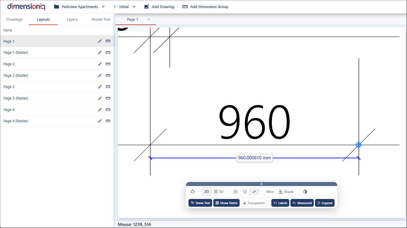 DimensionIQ allows multiple pages to be opened simultaneously, making it easier to switch between different layouts of a plan without closing and reopening layouts, and enabling you to to easily move between drawings while working. Each layout will be held in its own tab available at the top of the viewport.
