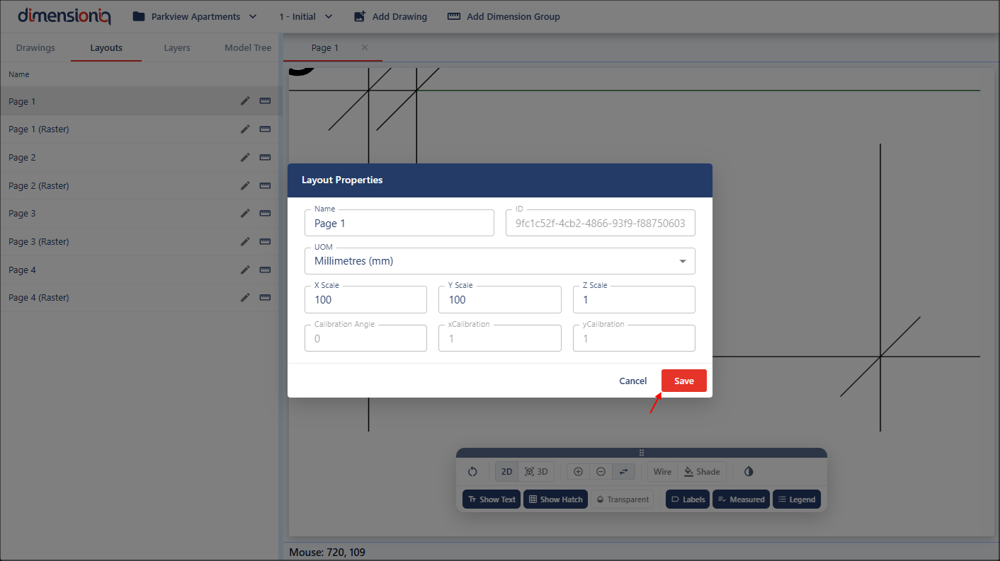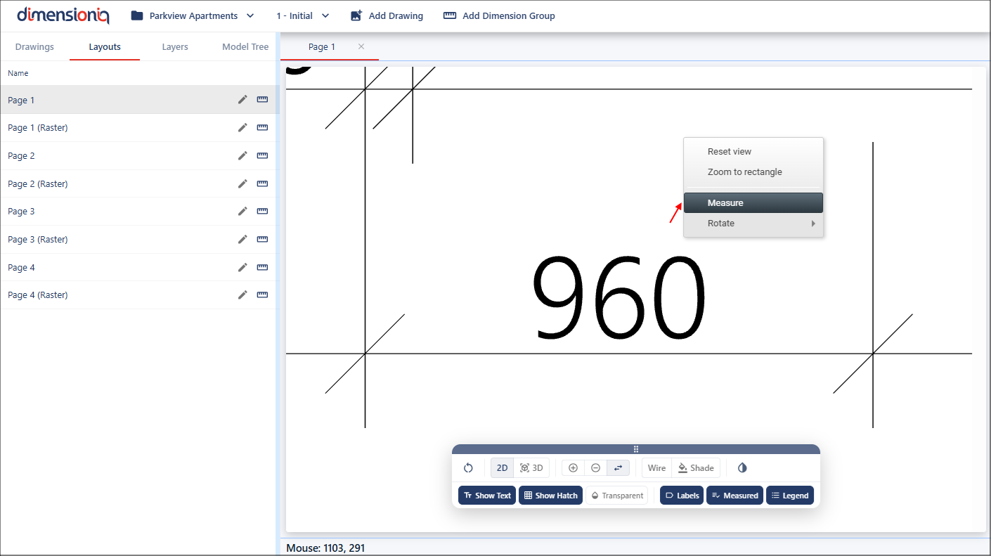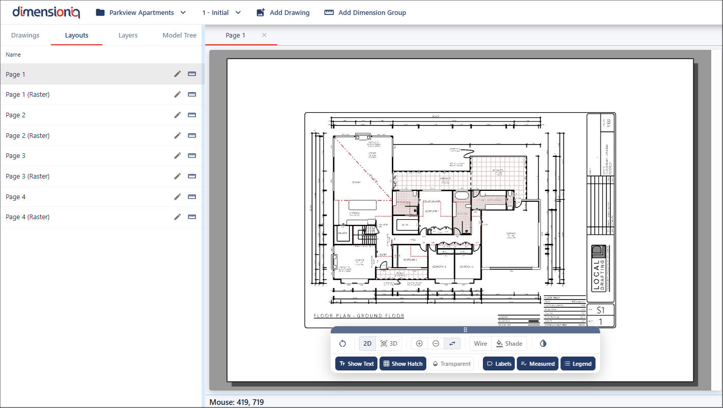 DimensionIQ allows multiple pages to be opened simultaneously, making it easier to switch between different layouts of a plan without closing and reopening layouts, and enabling you to to easily move between drawings while working. Each layout will be held in its own tab available at the top of the viewport.