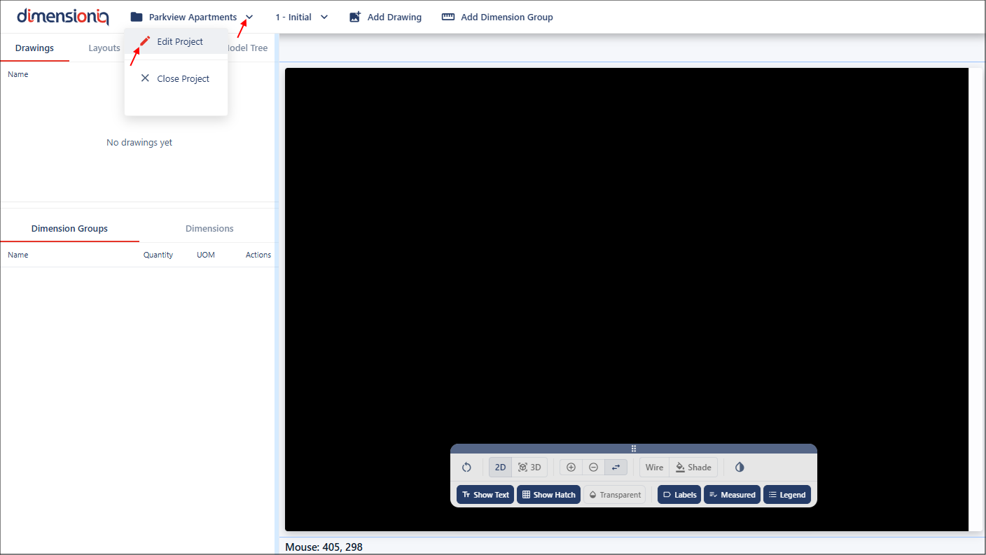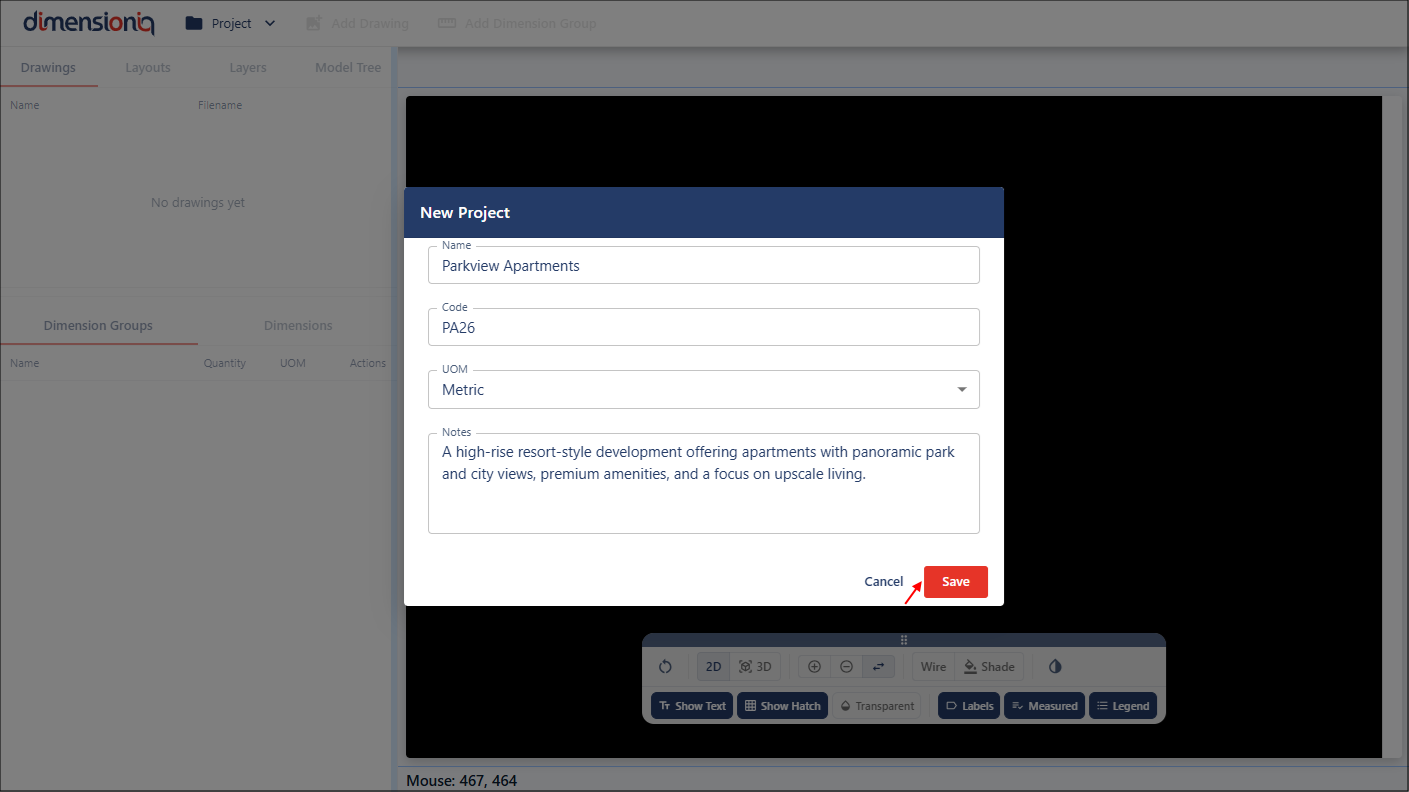 Creating a project is the first step in setting up your workspace in DimensionIQ. A project acts as the top-level container that holds all drawings, folders, and measurements associated with a specific job or estimate.