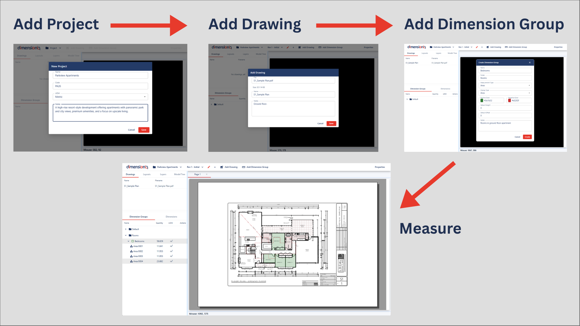 A project must be created before drawings can be added, and drawings must exist before measurements can be taken.